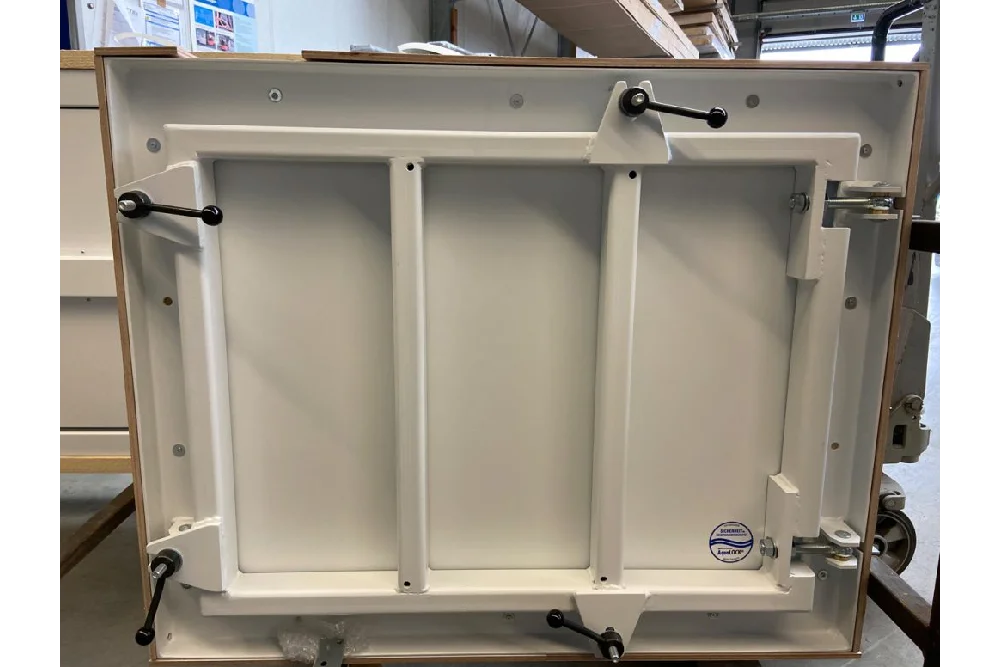 Die AquaLOCK® Klappe bietet kompakten und leistungsstarken Hochwasserschutz für Öffnungen bis 1300 × 1300 mm – im Innen- wie im Außenbereich.